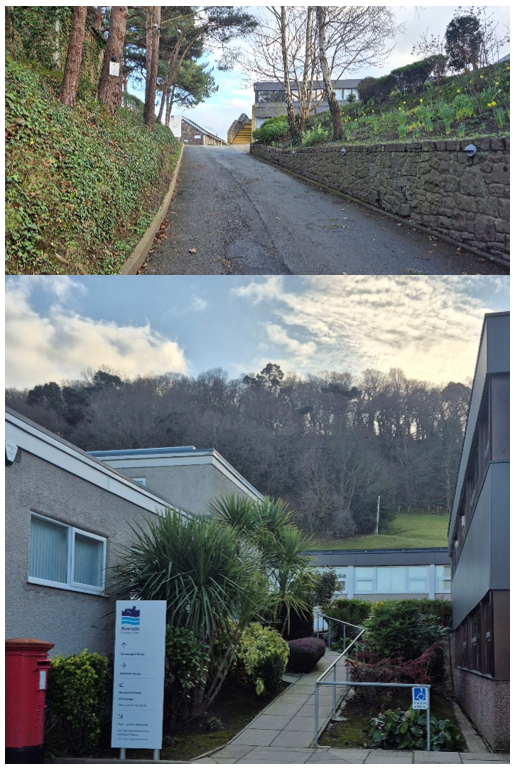 Once on Benarth Road you’ll approach an open-gated, uphill driveway bearing right. Once up this driveway you’ll find the main entrance to Connaught House up on your right (next to the red postbox), and a few parking spaces to your left. Continue straight ahead for additional parking on a lower level/just over the small hill.